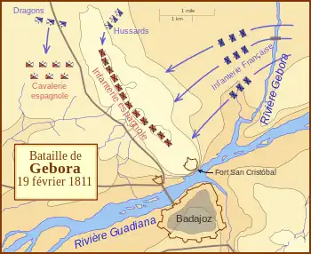 La pluie s'apaisa enfin durant la nuit du 18 février et la Gebora était à nouveau guéable[28],[29]. Dans la soirée, Soult dirigea neuf bataillons d'infanterie, trois escadrons de cavalerie et deux batteries d'artillerie, le tout sous le commandement de Mortier, traverser un pont enjambant la Guadiana à partir de la rive nord. Rejoint par les six régiments de cavalerie du général Latour-Maubourg, le maréchal avait sous ordres 4 500 fantassins, 2 500 cavaliers et 12 canons prêts à attaquer les lignes adverses à l'aube du 19 février[20],[30],[28]. Profitant d'un épais brouillard matinal, les Français traversèrent la Gebora, repoussèrent les avant-postes espagnols et s'avancèrent à moins de deux kilomètres de leurs lignes sans être repérés[30]. Simultanément, le 2e régiment de hussards, chargé par Latour-Maubourg de contourner le flanc gauche de Mendizábal, gravit discrètement les hauteurs au nord et tomba par surprise sur les unités sans méfiance de Charles d'Espagne[31],[32].