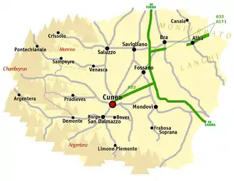 Plus à l'ouest, des combats se déroulèrent à Saluces et Pignerol. Le 16 octobre, les divisions de Victor et de François Muller attaquèrent les Autrichiens à Beinette avec de lourdes pertes dans les deux camps. En définitive, Melas leva le siège de Coni et battit en retraite. La division Lemoine fut impliquée dans des affrontements à Mondovì les 27 et 28 octobre[10]. Le 31 du même mois, Melas avec 15 000 hommes défit les 7 000 soldats de Grenier à Centallo, infligeant une perte d'environ 1 000 hommes et prenant quatre canons tout en ne perdant que 200 soldats[11]. Les Français n'en continuèrent pas moins de progresser vers Fossano. Duhesme affronta un contingent autrichien à Pignerol le 1er novembre et le lendemain, les troupes républicaines s'emparèrent de Mondovì[10].
