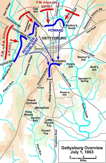 Pendant que les combats se déroulaient à l'Ouest, deux divisions du IIe Corps d'Ewell, qui rejoignaient Cashtown conformément à l'ordre de Lee de concentrer l'armée confédérée dans cette zone, rejoignent le champ de bataille depuis Carlisle et Harrisburg (au nord), tandis que le XIe corps du général unioniste Oliver O. Howard arrive par les routes de Baltimore Pike et Taneytown Road au sud de Gettysburg. En début d'après-midi la ligne de défense de l'Union forme un demi cercle de l'ouest au nord-est de Gettysburg[28]. Cependant, les Unionistes n'ont pas assez de troupes : celles qui sont déployées au nord de Chambersburg Pike sont vulnérables sur leur flanc droit. Doubleday est forcé d'engager des brigades de réserve pour tenter de tenir sa ligne[29].