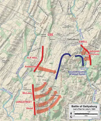 Le plan d'attaque de Lee pour la journée du 2 juillet prévoit que le 1er Corps de Longstreet prenne position furtivement au sud-ouest de l'armée de l'Union pour la prendre de flanc et la repousser vers Emmitsburg Road. L'attaque suit un ordre précis : les divisions des généraux John Bell Hood et Lafayette McLaws, du 1er Corps, doivent ouvrir les hostilités avant d'être appuyées par la division de Richard H. Anderson, du 3e Corps. L'engagement progressif des divisions doit permettre de repousser progressivement la ligne unioniste et empêcher Meade de déplacer des troupes depuis le centre pour soutenir son flanc gauche. Dans le même temps, les divisions des généraux Edward Johnson et Jubal Early, du 2e Corps doivent mener une attaque de diversion sur Culp's Hill et Cemetery Hill, toujours dans le but d'empêcher l'envoi de renforts vers le flanc gauche, lieu de l'attaque principale. Si l'occasion se présente, cette attaque de diversion peut être amenée à devenir un véritable assaut[45],[46].