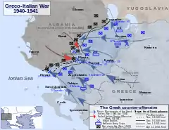 Les Italiens traversent la rivière Kalamas et se dirigent vers Ioannina, mais sont vite repoussés avant d'être poursuivis par l'armée grecque, d'abord en Grèce même, puis sur le territoire albanais. Après trois semaines d'offensive, le territoire grec est libéré et la contre-attaque se poursuit. Celle-ci est menée avec succès par les Grecs, les renforts italiens n'ayant que peu d'effet. Korçë, la plus grande ville d'Albanie est prise par les Grecs le 13 novembre, Pogradec et Argyrokastro le 4 décembre, Himarë le 24 et Këlcyrë le 10 janvier.