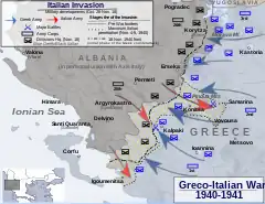 La guerre italo-grecque débute le , lorsque l'ambassadeur d'Italie en Grèce, Emanuele Grazzi présente un ultimatum au premier ministre grec, Ioánnis Metaxás. Mussolini exige le libre passage de ses troupes afin d'occuper des sites stratégiques non définis sur le territoire grec[10]. Metaxás rejette l'ultimatum, un fait commémoré depuis lors du Jour du Non. L’Italie envahit la Grèce depuis l'Albanie avant même la fin de l'ultimatum[11].