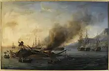 À 4 h, le 25 août, la batterie d'artillerie assemblée sur la côte ouvrit le feu sur les HMS Sirius et Iphigenia qui répliquèrent du mieux qu'ils pouvaient. Le HMS Sirius étant irrécupérable, Pym fit évacuer l'équipage et les équipements militaires avant d'incendier la frégate à 9 h peu après que le HMS Iphigenia se soit éloigné de la batterie française en utilisant un canon en guise d'ancre car il avait perdu les siennes la veille[51]. Les Français tentèrent d'atteindre le HMS Sirius et de le capturer avant qu'il n'explose mais ils firent demi-tour quand Pym lança ses propres canots contre ceux des Français[52]. Les dernières munitions de la frégate explosèrent à 11 h[53]. Dans la matinée du 25 août, Duperré envoya une véritable section d'abordage à bord du HMS Nereide qui mouilla les ponts pour éviter un incendie provoqué par les braises issues des navires brûlant dans la baie et évacua 75 corps de la frégate[52].