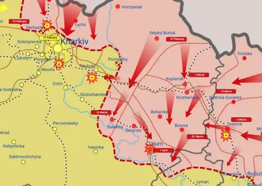 Au sein de l'offensive du Nord-Est de l'Ukraine, la Russie opère un repositionnement de ses forces en adéquation avec ses nouveaux objectifs stratégiques. À partir du , les troupes qui étaient engagées dans l'axe de Soumy à Brovary, où elles étaient venues en soutien de l'offensive de Kiev, opèrent un repli vers l'est en vue de leur redéploiement[63]. Ces forces sont notamment mises au service de la bataille d'Izioum, et la Russie parvient à capturer celle-ci le , à l'issue d'un affrontement de plusieurs semaines. La prise d'Izioum lui permet de poursuivre l'offensive en direction du sud-est[64]. Dans les jours qui suivent, la Russie retire l'ensemble des troupes engagées dans l'offensive de Kiev, et termine le repli de l'axe de Soumy, au profit d'une relance de l'invasion par l'est.
