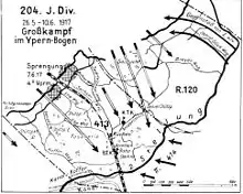 Les régiments allemands tiennent entre 640 et 1 100 mètres (700-1 200 yards) de première ligne avec un bataillon en première ligne, un second bataillon en soutien et un 3e bataillon en réserve à une distance de 4,8 km à 6,4 km à l'arrière du front. Le bataillon en ligne a trois compagnies dans le premier système défensif sur des lignes de défenses appelées « IA », « IB » et « IC » et la dernière compagnie du bataillon est placée sur la ligne intermédiaire à Sonne associée avec une compagnie du bataillon de soutien immédiatement disponible pour une contre-attaque entre la première ligne et la seconde ligne (Höhen) sur la ligne de crête faîtière. Les trois autres compagnies du bataillon de soutien à l'abri dans la 2e ligne (Höhen). Environ 32 postes de mitrailleuses régimentaires sont dispersés sur le secteur autour de la zone défensive. La défense allemande est mobile, le rôle des Stosstrupps placés dans la ligne « IC » est de mener des contre-attaques pour reprendre « IA » et « IB ». En cas de repli, les bataillons de soutien doivent alors avancer pour reprendre le terrain perdu excepté sur la colline de Spanbroekmolen qui doit être défendue à tout prix.