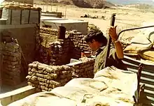 - À gauche sur la photographie on aperçoit des caisses de munitions et au-dessus un nid de mitrailleuse lourde Browning M2 entouré de sacs de sable. Le PFLOAG a avancé depuis les hauteurs que l'on aperçoit à droite dans le haut de l'image.