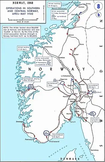 Le 28 mai, les Alliés étaient parvenus à reprendre Narvik aux Allemands, mais le déclenchement par les Allemands de l'invasion de la France et des Pays-Bas modifia considérablement le cours général de la guerre, réduisant considérablement l'importance stratégique de la Norvège. L'opération Alphabet, synonyme de la retraite générale des Alliés en Norvège, fut approuvée le 24 mai.