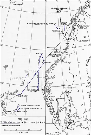 Apprenant ces mouvements allemands, l’Amirauté britannique en vint à la conclusion que les Allemands tentaient de forcer le blocus que les Alliés imposaient à l’Allemagne, et comptaient utiliser leurs flottes pour couper les voies commerciales de l’Atlantique. L’amiral Sir Charles Forbes, commandant en chef de la Home Fleet, en fut informé et appareilla à 20 h 15 afin de les intercepter.