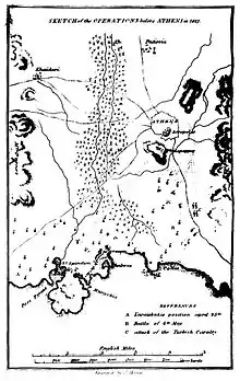 Les Grecs, qui avaient installé une tête de pont au Pirée, divisèrent leurs troupes en deux colonnes, l'une attaquant depuis le Pirée et l'autre depuis Phalère où elle fut transportée par les navires de Cochrane dans la nuit du 5 au 6 mai. L'opération de débarquement se fit dans le désordre. Le manque de coordination rendit les troupes vulnérables au matin du 6 mai : l'avant-garde atteignit Athènes alors que le débarquement n'était pas fini. Les Grecs furent repoussés par la cavalerie ottomane et subirent de lourdes pertes, principalement quand ils tentèrent, sous le feu ottoman, de fuir vers la mer.