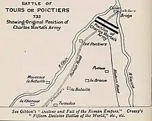 La bataille de Poitiers, anciennement en français bataille de Tours, appellation toujours utilisée par les anglophones, appelée dans des sources arabes « bataille du Pavé des Martyrs » (arabe : معركة بلاط الشهداء), a lieu entre, d'une part, les Francs et les Burgondes[6],[7] dirigés par Charles Martel alliés aux Aquitains[8],[9] eux-mêmes dirigés par Eudes, et d'autre part une armée omeyyade menée par Abd al-Rahman, gouverneur général d'al-Andalus.