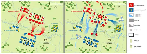 Après plusieurs jours de batailles mineures, Khmelnytsky mène son armée le matin du 13 septembre en criant "Pour la foi, braves guerriers, pour la foi !", Tuant de nombreux cavaliers polonais alors qu'ils fuyaient à travers l'Ikva. Cette nuit-là, les commandants polonais décident de se retirer à Starokostiantyniv le lendemain, Wiśniowiecki étant chargé de courvrir la retraite. Cependant, des rumeurs commencent à circuler parmi les troupes selon lesquelles les commandants avaient abandonné le camp et pris la fuite. La retraite tourne à la débandade, abandonnant le matériel et les blessés. Ne s'arrêtant pas à Starokostiantyniv, Koniecpolski est allé à Brody, Ostrorog à Olesko, Zaslawski à Vychnivets.