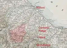 Entre le 4 et le 6 septembre se déroule la première bataille de Coriano : les forces canadiennes sont bloquées à proximité de Riccione et Coriano, celles britanniques à Passano et San Savino. Dans leur tentative de contourner Coriano, les troupes britanniques sont à nouveau stoppées à Croce et dans la bataille de Gemmano.