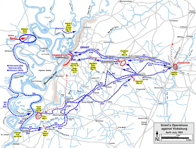 Pour s'assurer que des troupes ne se retirent vers Grand Gulf afin d'assister les confédérés présents là-bas, une force combinée de l'armée et de la marine feint une attaque sur Snyder's Bluff, Mississippi. Le après-midi, le lieutenant commander K. Randolph Breese, avec huit canonnières et dix transports emmenant la division du major général Francis Blair, remonte lentement la rivière Yazoo vers l'embouche de Chickasaw Bayou où il reste pour la nuit. À 9 heures du matin le lendemain, la force, l’exception d'une canonnière, poursuit en amont vers Drumgould's Bluff et engage le combat avec les batteries ennemies. Pendant le combat, le Choctaw est touché plus de cinquante fois, mais aucune victime n'est à déplorer. Vers 18 heures, les troupes débarquent et marchent le long de Blake's Levee en direction des canons. Alors qu'elles approchent de Drumgould's Bluff, une batterie ouvre le feu sur elles, créant des ravages et des pertes. La progression de l'Union s'arrête et, après la tombée de la nuit, les hommes rembarquent sur les transports. Le lendemain matin, les transports débarquent d'autres troupes. Le terrain marécageux et l'artillerie lourde ennemie les obligent à se retirer. Les canonnières ouvrent de nouveau le feu, vers 15 heures le , occasionnant quelques dégâts. Plus tard, le feu des canonnières se relâche et cesse totalement après la tombée de la nuit. Sherman a reçu des ordres pour débarquer ses troupes à Milliken's Bend, et donc les canonnières retournent vers leur ancrage à l'embouchure de la Yazoo.