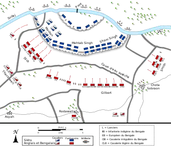 Deux divisions anglaises sous le commandement d'Harry Smith et du major general Walter Gilbert feignirent d'attaquer l'aile gauche sikhe tandis qu'une autre division sous le major general Robert Henry Dick portait l'attaque principale sur l'aile droite, là même où les défenses étaient faites de sable doux et étaient plus basses et plus faibles que le reste de la ligne. Lal Singh aurait envoyé Shams-ud-Din donner cette information à Sir Henry Lawrence, agent politique au quartier-général de Gough. Néanmoins, la division de Dick qui, pourtant, avait dans un premier temps pris pied dans les lignes sikhes, dut faire marche arrière du fait des contre-attaques sikhes. Dick lui-même trouva la mort. Alors que les Anglais reculaient, des soldats sikhs attaquèrent l'aile gauche anglaise affaiblie dans le fossé devant leurs retranchements.
