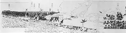 En attendant, la bataille navale d'Awa avait lieu le même jour dans la Mer Intérieure voisine. C'était la première bataille navale entre des flottes modernes au Japon, et elle s'est conclue par une petite victoire du shogunat sur une flotte de Satsuma, mais cela n'a eu aucune répercussion sur le déroulement de la bataille terrestre.