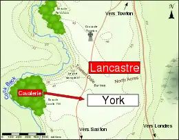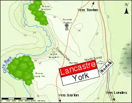 La bataille a lieu sur un plateau entre les villages de Saxton (au sud) et de Towton (au nord). C'est une région agricole qui compte beaucoup de vastes espaces dégagés et de petites routes sur lesquelles les armées peuvent manœuvrer[55]. Deux routes sont situées dans la zone des combats : Old London Road, qui relie Towton à la capitale anglaise, et une route qui va de Towton à Saxton. Le Cock Beck, un ruisseau aux rives escarpées, suit un cours en forme de « S » au nord et à l'ouest du plateau. Le plateau est coupé en deux par Towton Dale, une vallée qui part de l'ouest de celui-ci jusqu'à North Acres à l'est. Des zones boisées sont situées le long du Cock Beck ; Renshaw Woods au nord-ouest du plateau, et Castle Hill Wood au sud-ouest de Towton Dale le long d'un coude que suit le ruisseau. La zone au nord-est de ce bois est connue après la bataille sous le nom de Bloody Meadow (« le pré sanglant »)[56].