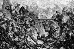 En 1464, à la suite des batailles de Hedgeley Moor et de Hexham, la maison d'York anéantit les dernières résistances des Lancastre au nord de l'Angleterre[86]. Édouard IV règne sans interruption jusqu'en 1470 mais ses relations avec Neville se détériorent progressivement, ce dernier finissant par se rallier à la Maison de Lancastre. Neville oblige Édouard IV à fuir l'Angleterre et restaure Henri VI sur le trône[87]. Cette restauration est toutefois de courte durée, car Édouard IV reconquiert le trône après avoir vaincu Neville et les Lancastre lors des batailles de Barnet et de Tewkesbury en 1471[88].
