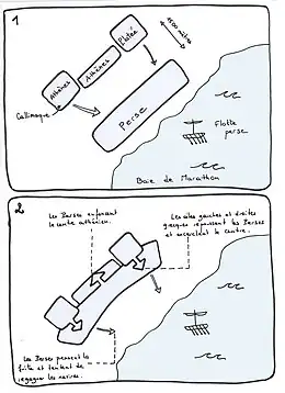 La stratégie des Perses reste elle aussi hypothétique. Selon E. Lévy, ils souhaitent vider la cité de ses défenseurs, les fixer à Marathon, en débarquant la moitié de leurs troupes et contourner les hoplites pour prendre Athènes par la mer, ses portes ouvertes par les hommes d'Hippias[16]. C'est une des raisons pour lesquelles, bien qu'en supériorité numérique, les Perses n'auraient pas immédiatement attaqué. Une autre est qu'ils se méfient des hoplites, beaucoup plus puissants que leur infanterie légère[50]. Une partie des troupes perses, y compris la cavalerie, pourrait donc avoir rembarqué, avec pour objectif Phalère, afin d'atteindre rapidement l'acropole d'Athènes[48]. Les troupes restantes auraient alors franchi le Charadra, le petit ruisseau qui traverse la plaine de Marathon avant de se perdre dans des marais littoraux, afin d'empêcher le retour des forces grecques vers la cité.