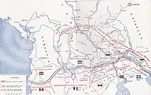 - En deuxième échelon, deux divisions serbes, Timok et Yougo-slave[1], pour l'exploitation de la percée en cas de succès.