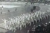 Depuis les Jeux olympiques de 1920 à Anvers en Belgique, le salut olympique fait partie du rituel. Il se pratique le bras droit replié puis tendu sur le côté. On l’appelle également « salut de Joinville ». Aux Jeux olympiques d'été de 1936 au Stadium de Berlin, lorsque la délégation française conduite par le discobole Jules Noël défile devant la tribune officielle, avec 201 athlètes faisant le salut olympique, le stade de Berlin se soulève d’ovations délirantes, le geste des Français étant pris pour le salut hitlérien[5]. Le , la commission exécutive du Comité international olympique (CIO), à la demande de M. Poplimont du comité olympique belge, décide que le salut olympique, lors des manifestations d’ouverture des Jeux, est changé « afin d’éviter toute confusion avec d’autres saluts de triste mémoire »[6].
