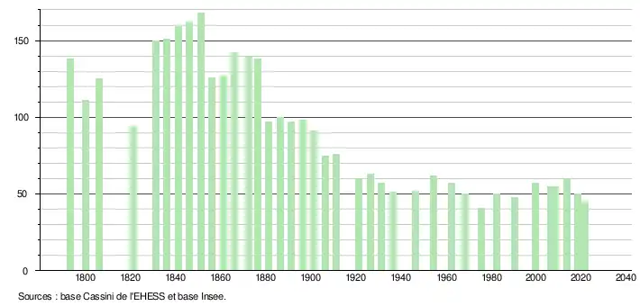 L'évolution du nombre d'habitants est connue à travers les recensements de la population effectués dans la commune depuis 1793. Pour les communes de moins de 10 000 habitants, une enquête de recensement portant sur toute la population est réalisée tous les cinq ans, les populations légales des années intermédiaires étant quant à elles estimées par interpolation ou extrapolation[15]. Pour la commune, le premier recensement exhaustif entrant dans le cadre du nouveau dispositif a été réalisé en 2008[16].