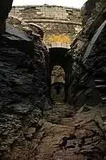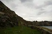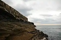 ![]() Vue de la plate-forme vers le sud, le glacis du mur en premier plan | ![]() Vue sur l’escarpe et les embrasures, du niveau de l’eau à marée basse |