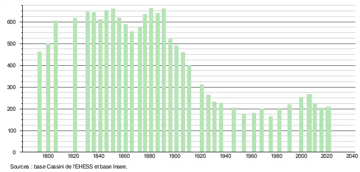 L'évolution du nombre d'habitants est connue à travers les recensements de la population effectués dans la commune depuis 1793. Pour les communes de moins de 10 000 habitants, une enquête de recensement portant sur toute la population est réalisée tous les cinq ans, les populations légales des années intermédiaires étant quant à elles estimées par interpolation ou extrapolation[14]. Pour la commune, le premier recensement exhaustif entrant dans le cadre du nouveau dispositif a été réalisé en 2005[15].
