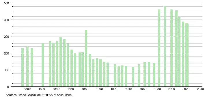 L'évolution du nombre d'habitants est connue à travers les recensements de la population effectués dans la commune depuis 1793. Pour les communes de moins de 10 000 habitants, une enquête de recensement portant sur toute la population est réalisée tous les cinq ans, les populations légales des années intermédiaires étant quant à elles estimées par interpolation ou extrapolation[15]. Pour la commune, le premier recensement exhaustif entrant dans le cadre du nouveau dispositif a été réalisé en 2005[16].