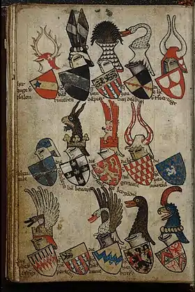 - Le duc de Bourgoingne tout seul fist porter le premier escu devant lui par messire Raoul de Rainneval et le seigneur de la Gruthuse. Et fut soustenu de Lambequin de la Coustre et de Jehan de Pantaliers, frere au mareschal de Bourgoingne. Aprés, le second escu le conte d’Eu et messire Phelippe de Bar, l’escu fut tenu de Waleran de la Salle et de l’Esclave d’Anechin. Aprés, le conte de la Marche et messire Phelippe d’Artois, l’escu fut tenu de Gillon de Brest et de Robyn de Florygny. Aprés, messire Robert de Namur, deléz lui Guillaume de Namur, sen nepveu, l’escu fut tenu de Campbernard d’Estervaille. (Froissart, Paris ms. fr. 2644, folio 298r)