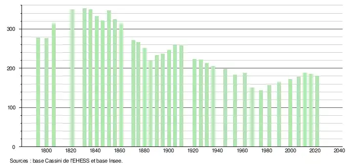 L'évolution du nombre d'habitants est connue à travers les recensements de la population effectués dans la commune depuis 1793. Pour les communes de moins de 10 000 habitants, une enquête de recensement portant sur toute la population est réalisée tous les cinq ans, les populations légales des années intermédiaires étant quant à elles estimées par interpolation ou extrapolation[20]. Pour la commune, le premier recensement exhaustif entrant dans le cadre du nouveau dispositif a été réalisé en 2006[21].