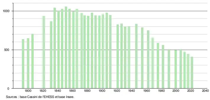 L'évolution du nombre d'habitants est connue à travers les recensements de la population effectués dans la commune depuis 1793. Pour les communes de moins de 10 000 habitants, une enquête de recensement portant sur toute la population est réalisée tous les cinq ans, les populations légales des années intermédiaires étant quant à elles estimées par interpolation ou extrapolation[36]. Pour la commune, le premier recensement exhaustif entrant dans le cadre du nouveau dispositif a été réalisé en 2006[37].