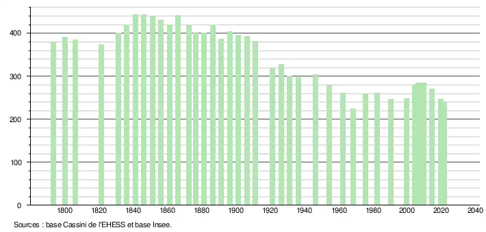 L'évolution du nombre d'habitants est connue à travers les recensements de la population effectués dans la commune depuis 1793. Pour les communes de moins de 10 000 habitants, une enquête de recensement portant sur toute la population est réalisée tous les cinq ans, les populations légales des années intermédiaires étant quant à elles estimées par interpolation ou extrapolation[9]. Pour la commune, le premier recensement exhaustif entrant dans le cadre du nouveau dispositif a été réalisé en 2004[10].
