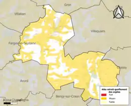 La commune est vulnérable au risque de mouvements de terrains constitué principalement du retrait-gonflement des sols argileux[14]. Cet aléa est susceptible d'engendrer des dommages importants aux bâtiments en cas d’alternance de périodes de sécheresse et de pluie. 67,8 % de la superficie communale est en aléa moyen ou fort (90 % au niveau départemental et 48,5 % au niveau national). Sur les 858 bâtiments dénombrés sur la commune en 2019, 495 sont en aléa moyen ou fort, soit 58 %, à comparer aux 83 % au niveau départemental et 54 % au niveau national. Une cartographie de l'exposition du territoire national au retrait gonflement des sols argileux est disponible sur le site du BRGM[15],[Carte 1].