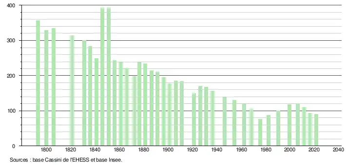 L'évolution du nombre d'habitants est connue à travers les recensements de la population effectués dans la commune depuis 1793. Pour les communes de moins de 10 000 habitants, une enquête de recensement portant sur toute la population est réalisée tous les cinq ans, les populations légales des années intermédiaires étant quant à elles estimées par interpolation ou extrapolation[14]. Pour la commune, le premier recensement exhaustif entrant dans le cadre du nouveau dispositif a été réalisé en 2006[15].
