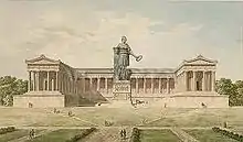 Dans ce contexte Louis a déjà en tant que prince héritier la volonté de réunir la Bavière, qui vient d'acquérir de nouveaux territoires en Souabe et en Franconie et de promouvoir la nation allemande. Cela a pour conséquences la construction de nombreux monuments nationaux comme le pilier de la constitution à Gaibach en 1828, le Walhalla proche de Ratisbonne en 1842, le Ruhmeshalle à Munich en 1853 et le Befreiungshalle à Kelheim en 1863[6]. Le roi finance ces ouvrages grâce à sa fortune personnelle. En s'inspirant d'œuvres d'art et de monuments existants, ils doivent sur le fond et dans la forme représenter l'unité, politique en particulier, ce qui est particulièrement remarquable en Allemagne[6].