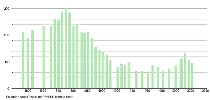 L'évolution du nombre d'habitants est connue à travers les recensements de la population effectués dans la commune depuis 1793. Pour les communes de moins de 10 000 habitants, une enquête de recensement portant sur toute la population est réalisée tous les cinq ans, les populations légales des années intermédiaires étant quant à elles estimées par interpolation ou extrapolation[25]. Pour la commune, le premier recensement exhaustif entrant dans le cadre du nouveau dispositif a été réalisé en 2007[26].