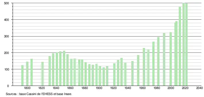 L'évolution du nombre d'habitants est connue à travers les recensements de la population effectués dans la commune depuis 1793. Pour les communes de moins de 10 000 habitants, une enquête de recensement portant sur toute la population est réalisée tous les cinq ans, les populations légales des années intermédiaires étant quant à elles estimées par interpolation ou extrapolation[17]. Pour la commune, le premier recensement exhaustif entrant dans le cadre du nouveau dispositif a été réalisé en 2007[18].