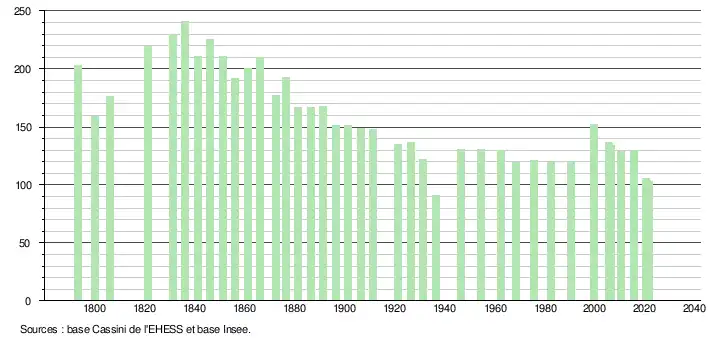 L'évolution du nombre d'habitants est connue à travers les recensements de la population effectués dans la commune depuis 1793. Pour les communes de moins de 10 000 habitants, une enquête de recensement portant sur toute la population est réalisée tous les cinq ans, les populations légales des années intermédiaires étant quant à elles estimées par interpolation ou extrapolation[21]. Pour la commune, le premier recensement exhaustif entrant dans le cadre du nouveau dispositif a été réalisé en 2005[22].