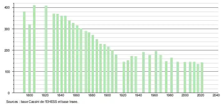 L'évolution du nombre d'habitants est connue à travers les recensements de la population effectués dans la commune depuis 1793. Pour les communes de moins de 10 000 habitants, une enquête de recensement portant sur toute la population est réalisée tous les cinq ans, les populations légales des années intermédiaires étant quant à elles estimées par interpolation ou extrapolation[22]. Pour la commune, le premier recensement exhaustif entrant dans le cadre du nouveau dispositif a été réalisé en 2006[23].