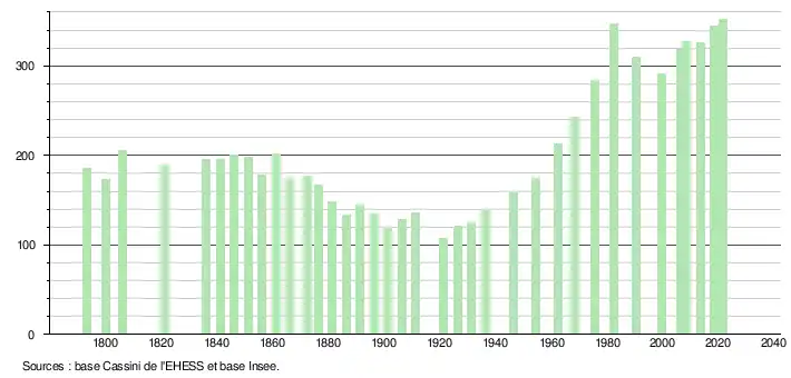 L'évolution du nombre d'habitants est connue à travers les recensements de la population effectués dans la commune depuis 1793. Pour les communes de moins de 10 000 habitants, une enquête de recensement portant sur toute la population est réalisée tous les cinq ans, les populations légales des années intermédiaires étant quant à elles estimées par interpolation ou extrapolation[33]. Pour la commune, le premier recensement exhaustif entrant dans le cadre du nouveau dispositif a été réalisé en 2008[34].