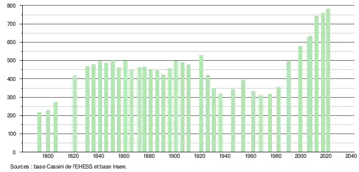 L'évolution du nombre d'habitants est connue à travers les recensements de la population effectués dans la commune depuis 1793. Pour les communes de moins de 10 000 habitants, une enquête de recensement portant sur toute la population est réalisée tous les cinq ans, les populations légales des années intermédiaires étant quant à elles estimées par interpolation ou extrapolation[27]. Pour la commune, le premier recensement exhaustif entrant dans le cadre du nouveau dispositif a été réalisé en 2007[28].