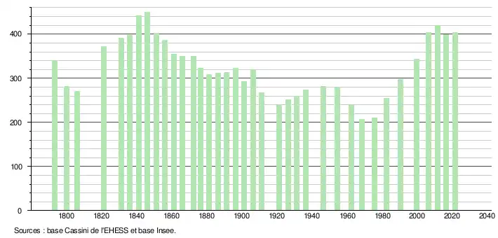 L'évolution du nombre d'habitants est connue à travers les recensements de la population effectués dans la commune depuis 1793. Pour les communes de moins de 10 000 habitants, une enquête de recensement portant sur toute la population est réalisée tous les cinq ans, les populations légales des années intermédiaires étant quant à elles estimées par interpolation ou extrapolation[37]. Pour la commune, le premier recensement exhaustif entrant dans le cadre du nouveau dispositif a été réalisé en 2006[38].