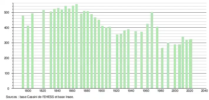 L'évolution du nombre d'habitants est connue à travers les recensements de la population effectués dans la commune depuis 1793. Pour les communes de moins de 10 000 habitants, une enquête de recensement portant sur toute la population est réalisée tous les cinq ans, les populations légales des années intermédiaires étant quant à elles estimées par interpolation ou extrapolation[22]. Pour la commune, le premier recensement exhaustif entrant dans le cadre du nouveau dispositif a été réalisé en 2005[23].