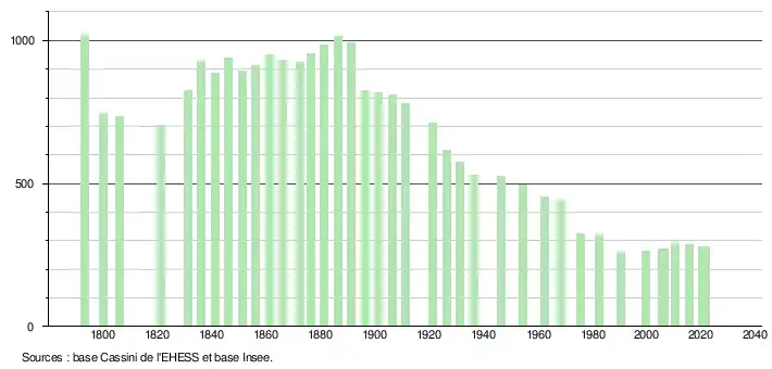 L'évolution du nombre d'habitants est connue à travers les recensements de la population effectués dans la commune depuis 1793. Pour les communes de moins de 10 000 habitants, une enquête de recensement portant sur toute la population est réalisée tous les cinq ans, les populations légales des années intermédiaires étant quant à elles estimées par interpolation ou extrapolation[16]. Pour la commune, le premier recensement exhaustif entrant dans le cadre du nouveau dispositif a été réalisé en 2005[17].