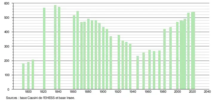 L'évolution du nombre d'habitants est connue à travers les recensements de la population effectués dans la commune depuis 1793. Pour les communes de moins de 10 000 habitants, une enquête de recensement portant sur toute la population est réalisée tous les cinq ans, les populations légales des années intermédiaires étant quant à elles estimées par interpolation ou extrapolation[18]. Pour la commune, le premier recensement exhaustif entrant dans le cadre du nouveau dispositif a été réalisé en 2004[19].