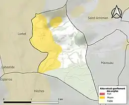 Le retrait-gonflement des sols argileux est susceptible d'engendrer des dommages importants aux bâtiments en cas d’alternance de périodes de sécheresse et de pluie. 32,5 % de la superficie communale est en aléa moyen ou fort (44,5 % au niveau départemental et 48,5 % au niveau national). Sur les 50 bâtiments dénombrés sur la commune en 2019, 44 sont en aléa moyen ou fort, soit 88 %, à comparer aux 75 % au niveau départemental et 54 % au niveau national. Une cartographie de l'exposition du territoire national au retrait gonflement des sols argileux est disponible sur le site du BRGM[40],[Carte 3].