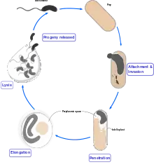 Bdellovibrio utilise des hydrolases pour casser les molécules de sa cellule-hôte, pour s'allonger et former un filament. Quand les nutriments de l'hôte sont épuisés, les filaments se séparent pour former la « progéniture » de Bdellovibrio. Ces derniers deviennent mobiles avant de provoquer la lyse de la cellule et de se disperser dans l'environnement. Le cycle de vie complet se déroule en trois heures. Il produit de 3 à 6 cellules-filles en moyenne pour une seule E. coli et jusqu'à 90 pour des proies plus grosses telles que les E. coli filamenteuses[3].