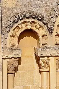 Beakheads sur une arcature de l'église Saint-Ouen de Rots.