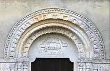 Arcatures avec beakheads dans l'église Saint-Ouen de Rots.