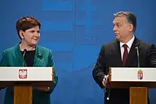 La politique prônée par la Pologne est proche de celles des autres pays du groupe de Visegrád (Hongrie, République tchèque et Slovaquie) et s'oppose frontalement aux positions de l'Allemagne et de la France, pays favorables à l'accueil de migrants[44]. Une crise diplomatique intervient entre la France et la Pologne le 25 août 2017. En visite en Bulgarie, le nouveau président français, Emmanuel Macron, qui cherche à revoir le statut des travailleurs détachés contre la volonté du gouvernement polonais, déclare que « la Pologne n'est en rien ce qui définit le cap de l'Europe » et que « le peuple polonais mérite mieux » que la position adoptée par Beata Szydło. En retour, celle-ci dénonce « l'arrogance » et le « manque d'expérience » du président français, ajoutant qu'il devrait essayer d'« avoir les mêmes résultats économiques et le même niveau de sécurité de ses citoyens que ceux garantis par la Pologne »[45].